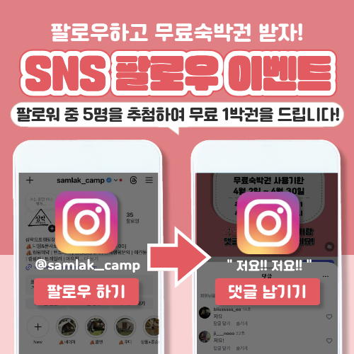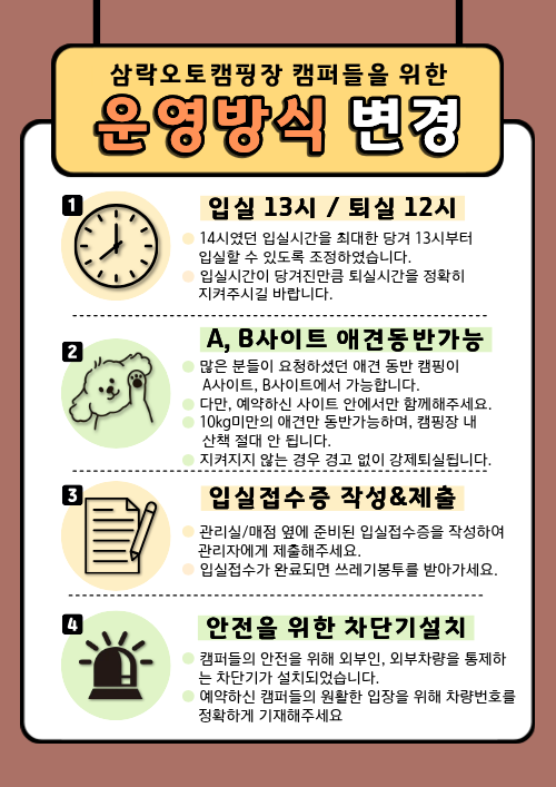 삼락오토캠핑장 이용안내문 (필독) 안녕하세요 삼락오토캠핑장 관리자입니다.캠핑장의 이용기준, 이용수칙, 주의 및 참고사항을 안내드립니다.아래 사항들을 지키지 않아 발생하는 일에 대해서는 캠핑장 측에서 책임지지 않습니다. ※ 이용 기준1. 이용시간 예약일 오후 14시부터 익일 12시까지 입니다. 2. 텐트 피칭 사이트 1개 당 1개의 텐트만 피칭 가능합니다. 하나의 사이트에 여러 동의 텐트를 피칭하는 것은 불가능합니다. 다른 이용객분들에게 혼동과 피해가 갈수있으니 지켜주시기 바랍니다. 예외) 캠핑장 만석으로 추가 사이트 예약이 불가능한 경우 추가 설치 가능하며, 텐트 1개 당 2만원의 비용이 발생합니다. 3. 인원 한 사이트 당 인원은 총 6인 (영유아, 방문객 포함) 까지입니다. 인원추가는 불가능하며, 6인 초과 시 추가사이트를 예약 부탁드립니다. (인원체크는 캠핑장입장 기준입니다. 잠시 왔다가는 인원도 포함해서 6인까지입니다.) 캠핑장 만석으로 추가 사이트 예약이 불가능한 경우에는 관리자에게 문의해주시기 바랍니다. 4. 차량 한 사이트 당 차량1대가 기본이며, 차량추가 가능합니다. (추가차량 수 제한없음) 차량추가는 입실 시 입실접수증에 작성하고 추가금을 결제하시면 추가등록됩니다. 5. 전기 캠핑장 내 전기사용량은 600W로 규제되어 있습니다. (C사이트는 전기사용 불가능) 초과사용 시 분전반의 이용이 불가능하여 타사이트에 피해가 갈 수 있음으로 사용량을 지켜주시기 바랍니다. ※ 이용 수칙1. 캠핑장 내에서는 10km 이하로 서행하여주시기 바랍니다. (어린이들이 항상 뛰어노는 공간이므로 과속은 절대 금지입니다.) 2. 예약자는 *신분증 필수 지참* 하시기 바랍니다. (얼굴이 나와있는 주민등록증 또는 여권 준비해주세요) 입장 시 입실접수증을 작성 및 제출하시고 봉투와 안내문을 받아가시면 됩니다. 3. 분리수거 (일반쓰레기, 음식물쓰레기, 분리수거) 일반쓰레기와 각종 분리수거를 위해 캠핑장 입구 쪽에 있는 분리수거장을 이용하시기 바랍니다. 음식물 쓰레기는 취사실 앞 음식물 통에 즉시 버려주시기 바랍니다. 4. 캠핑장 전구역 금연입니다. (화재위험) 5. 매너타임 밤 10시부터는 매너타임입니다. 고성방가 및 소음은 자제 부탁드리며, 2회 이상 민원이 접수될 시 퇴실조치 하겠습니다. ※ 애견동반캠핑 이용 수칙 애견동반캠핑은 A사이트, B사이트에 가능합니다. (C사이트 애견동반캠핑 안됩니다.) 다만, 타이용객에게 피해가 가지 않도록 지켜주셔야 하는 사항들이 있습니다. 1. 캠핑장 내 산책은 금지합니다. 예약자의 사이트 내에서만 동반 가능하며, 목줄여부와 관계없이 산책 적발시 즉시 퇴실조치합니다. 2. 배변은 다른 봉투에 한번 더 담은 후 지급받은 일반쓰레기봉투에 버리시거나, 자택으로 수거 바랍니다. 3. 소형견만 동반이 가능합니다. (10kg 미만 가능, 캠핑장 내에서 안고 다니셔야하기 때문에 안기 힘든 반려견은 입장이 어렵습니다.) 4. 반려동물로 인한 사고 및 모든 책임은 캠핑장에서 책임지지 않습니다. (짖음, 배변, 개물림, 텐트 또는 인사사고 등 모든 책임은 이용객에게 있습니다.) 5. 위 사항들을 지키지 않아 민원이 발생하거나 관리자에게 적발될 시 즉시 퇴실되며, 이에 응하지 않을 시 벌금이 부과될 수 있습니다.기본적인 에티켓이 지켜지지 않는 경우 환불 없이 이용중지 될 수 있고, 앞으로 삼락오토캠핑장은 반려견 출입이 되지 않을 수 있음으로 꼭 에티켓을 지켜주시기 바랍니다. ※ 주의 및 참고 사항 (캠핑장 측에서 책임지지 않습니다.)1. 전기배전함 A,B사이트는 전기사용 가능/ C사이트는 전기사용 불가능 A,B사이트 중 전기배전함과의 거리가 먼 사이트도 있습니다. 이 점 참고하시어 릴선은 여유있게 준비해주시기 바랍니다. (최소 15M ~ 최대 45M까지 필요하실 수 있습니다.) ★매점에서 릴선 대여가능/ 1박 대여료 5,000원 2. 와이파이는 공원내에 설치되어있는 부산wifi를 사용하시면 됩니다. 3. 일반사이트(C사이트) 는 전기사용과 차량진입이 안됩니다. 4. 주차 시 자동차 하부 주의 삼락오토캠핑장은 낙동강 수위가 올라가 물이 범람할 경우를 대비하여 사이트 자체가 고수부지에 위치해 있습니다. 이로 인해 사이트 내 주차할 시 진입로의 경사가 가파르기 때문에 자동차 하부와 사이트 높이에 주의하시기 바랍니다. 5. 삼락생태공원은 문화재 구역으로써 방역이 불가합니다. 이로 인해 모기 및 진드기 등 해충이 있으니 유의하여 주시기 바랍니다. 6. A사이트 옆 캠핑장 외부에서 진행중인 부전-마산 복선전철 공사로 인해 소음과 진동이 발생할 수 있으니 소음이나 진동에 민감하신 분께서는 가능한 B사이트로 예약해주시길 바랍니다. 7. 문의 문의시간 : 오전9시 ~ 오후6시 전화번호 : 010-2582-9062 주말에는 현장이 바쁜 관계로 통화연결이 어려울 수 있습니다. 문자로 문의사항 남겨주시면 빠른 시간 내에 답변드리도록 하겠습니다.